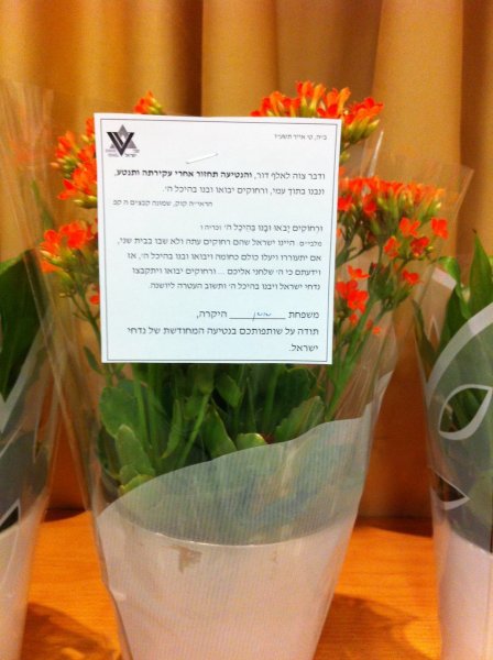 Rabbi Mass spoke about how the community has prospered in the year since they arrived in Israel and moved into their new homes. Hanan Orbach followed up with a lecture on Shavei Israel’s absorption vision for the community. The Kiryat Shemona adoptive families shared stories of their experiences and the Bnei Menashe reciprocated by handing out small gifts for each family including a special thank you letter.