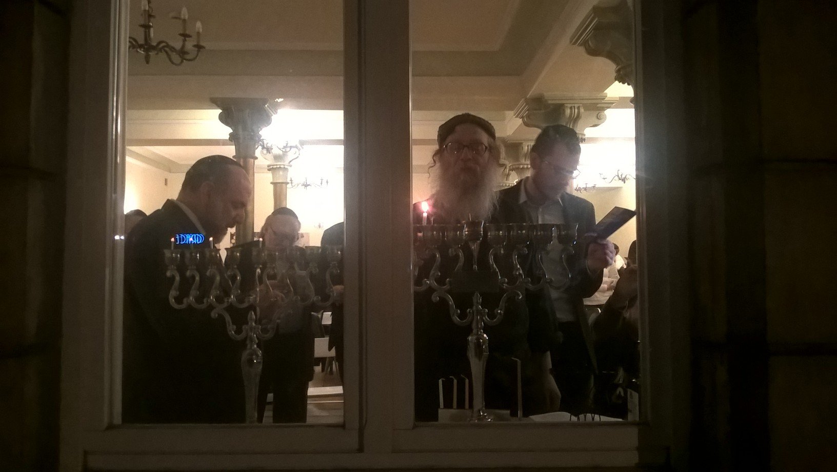 Rabbi Dawid Szichowsky led the Lodz Jewish community in candle lighting. They were honored by a special guest: Polish Chief Rabbi Michael Schudrich.