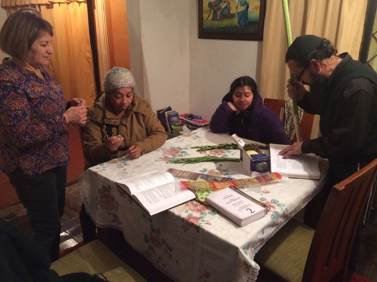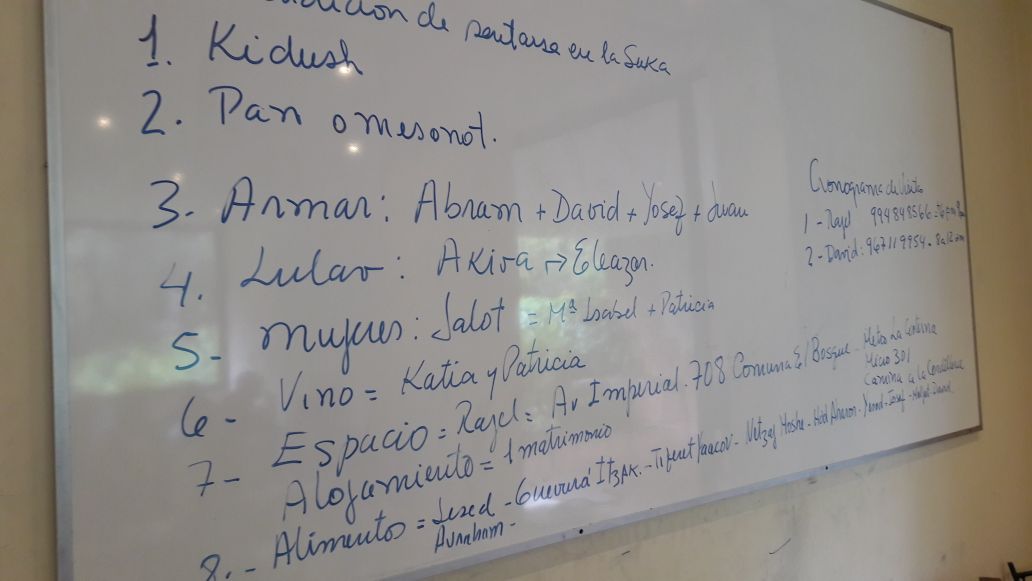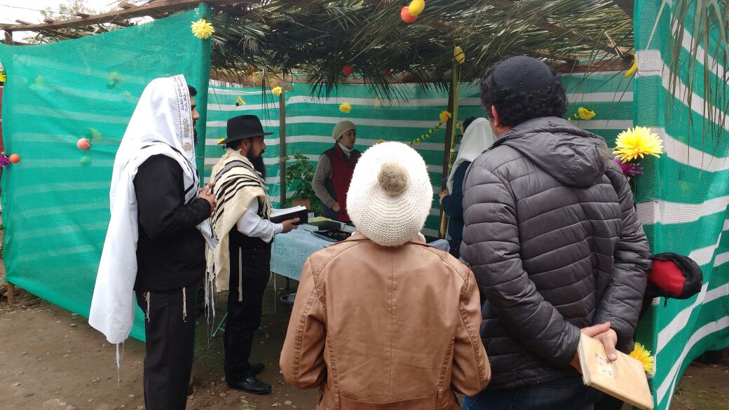 The community of Bnei Anousim in Chile built a fabulous “Sucat Shalom” – a sukka of peace. Here are pictures of the community shaking their lulav and etrog, eating snacks in their temporary outdoor homes, and learning the rules of Sukkot in class.