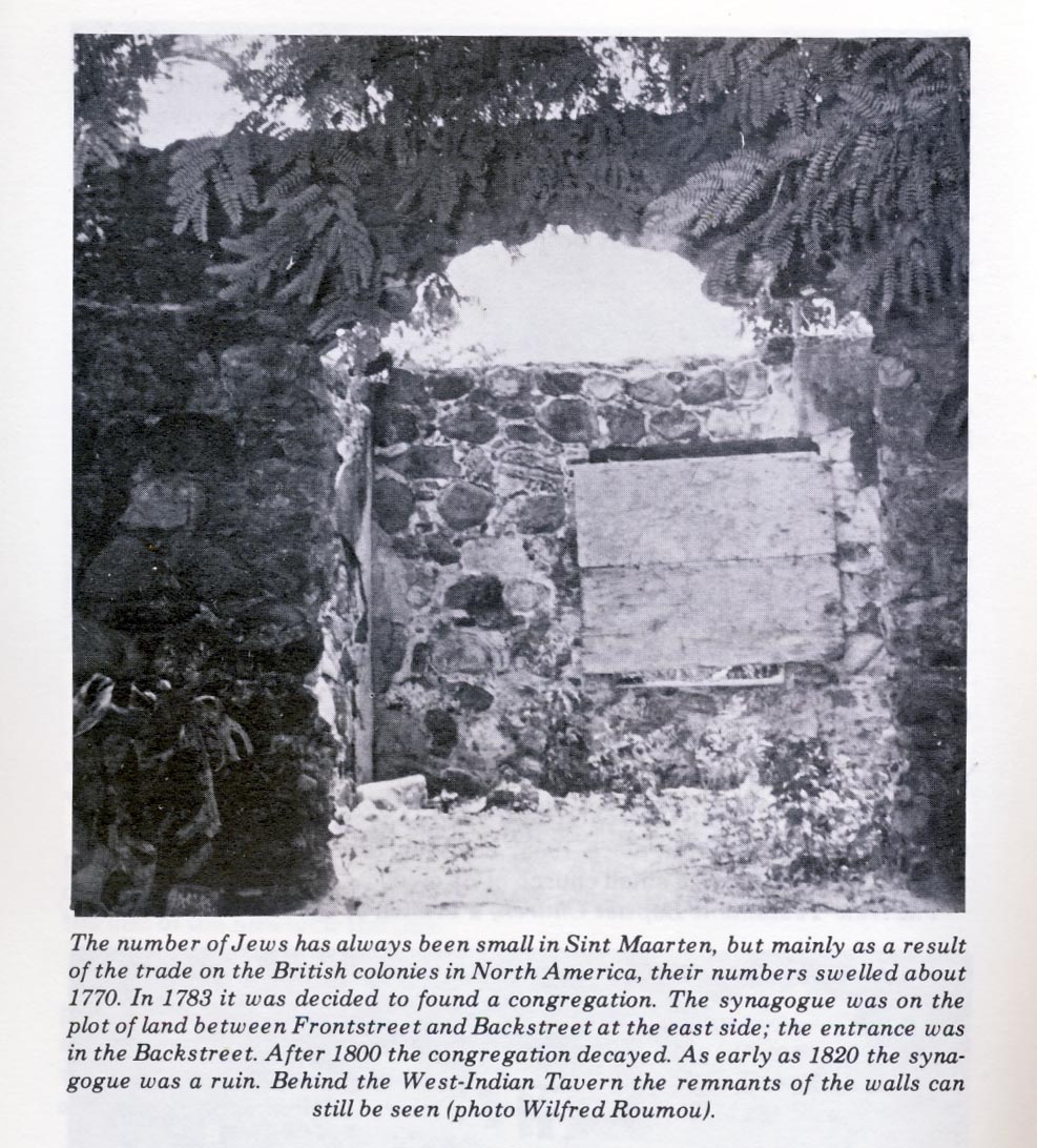 The request to the Parnassim in Amsterdam in 1783 for recognition and the Pereira family history provides documentary evidence for the existence of a Jewish Community in St Maarten. The presence of this community (rather temporary or not ) would be consistent with the history of the Jews on St Eustatius who were forced to relocate after the British attack by Rodney in 1781. The location on the East end of the Backstreet, on the south side by Teenstra in 1828 and by Hartog in 1977 is consistent with folklore that places a Synagogue at the site near the Guavabeery Emporium (previously known as the West Indian Tavern). A recent survey of this site by Norman Barka reveals a vacant lot and alley which contain archeologic remnants of an 18th century building. Recent finding of a flat surface object in the doorway which might have served as a mounting for a mezuzah gives credence to the theory that this building, while not necessarily built to be a synagogue, may have served the 18th century Sephardic Jewish congregation of Sint Maarten as a house of worship.