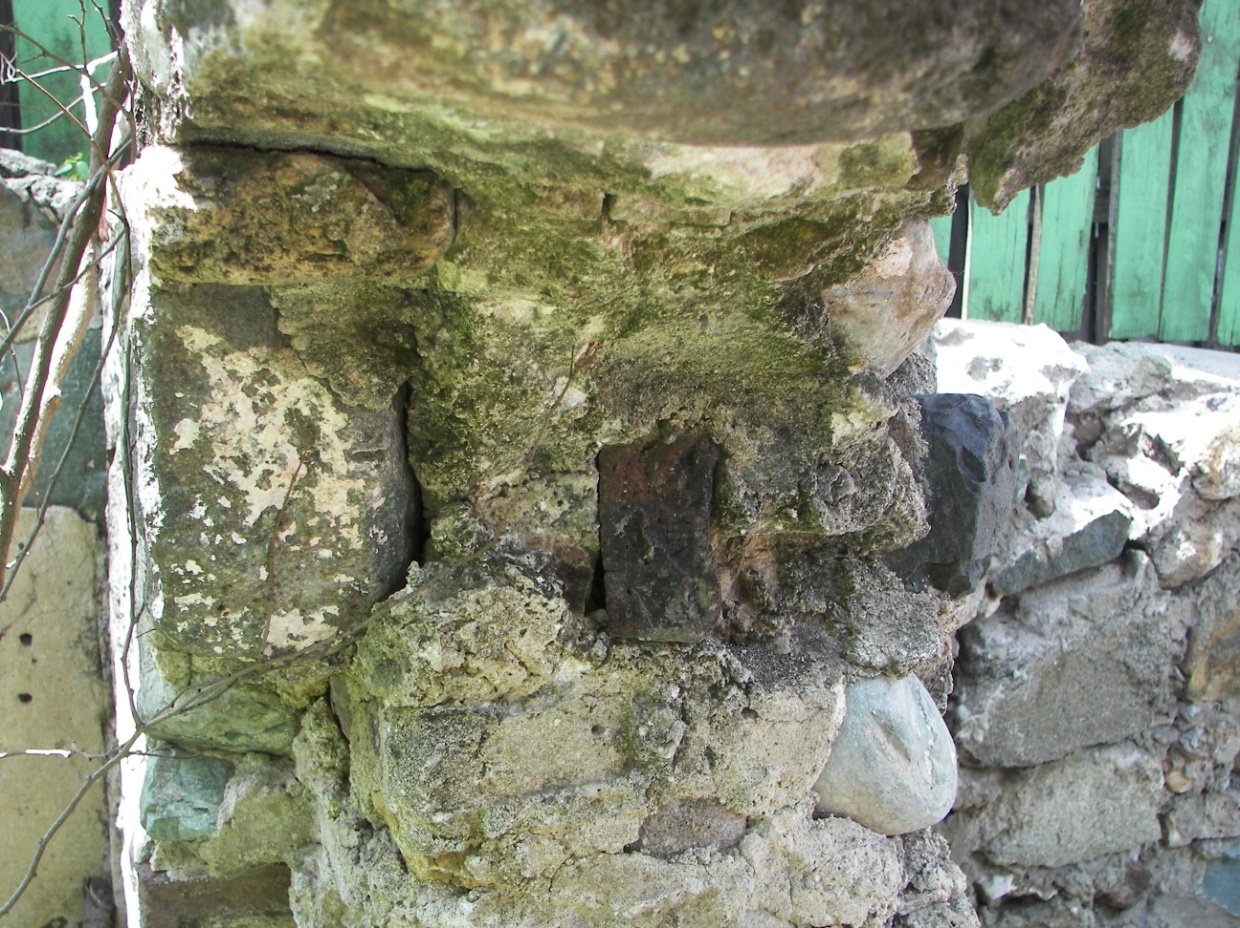 A recent survey of the site described by Professor Barka was conduced by myself and my wife in May 2010. We found the site in great disrepair. The four walls of the brick building still exist as does a small stone wall abutting the southwest wall. In his report Dr Barka writes “there is nothing inherent about the building itself to prove its former function as a synagogue” Our recent survey revealed the existence of one flat object located approximately two-thirds from the bottom of the right doorpost of the only entrance to the structure in the southwest wall. The object is either wood or stone and is oriented vertically as opposed to the stones composing the wall. Directly above the vertical stone is a hole in the wall. See pictures on next page.