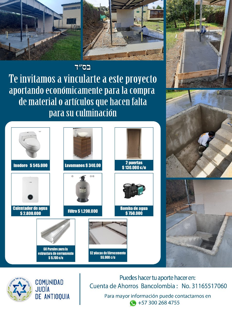 Rav Elad Villegas comments, “Thanks to the effort and help of the members of the Jewish Community of Antioquia and the generosity of some people, we have started the construction of our mikvah, we have already made the complete structure; we still have to prepare the space, this is the veneer, build the floor, bathroom, furnish, place the heating, raise walls and ceiling, we know that much is missing, but we also know that everything has its beginning so we continue standing working hard to carry out this work, which will benefit more than 50 families in our community, families from other communities in various municipalities and Jews who are passing through the city for various reasons.”
