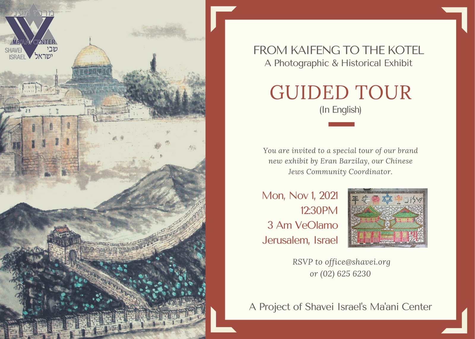 The first was a tour of our new exhibit on the Kaifeng Jewish community. The tour, which was held in English, included a slide presentation and an explanation by Eran Barzilay, the coordinator for our Kaifeng Jewish community. A Chinese speaker himself, Eran is extremely well-versed in the traditions and history of the Kaifeng Jewish community as well as having been there multiple times and having a personal relationship with many in the community.