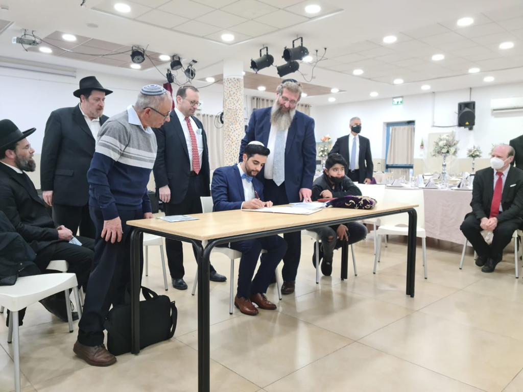 - Michael Freund and Rachamim Cohen are witnesses to Eliav signing the ketuba – Credit: Andrea Otamendie