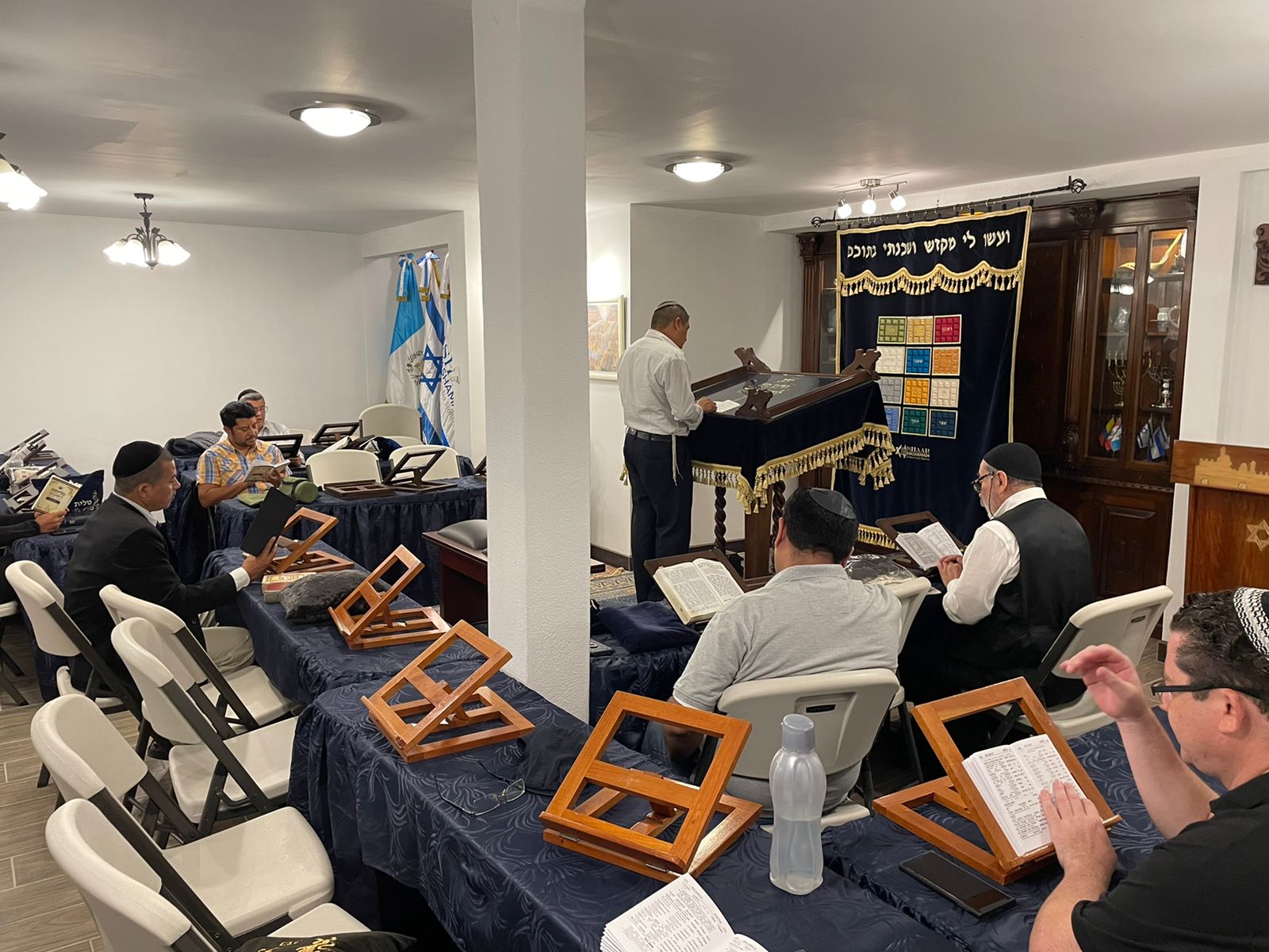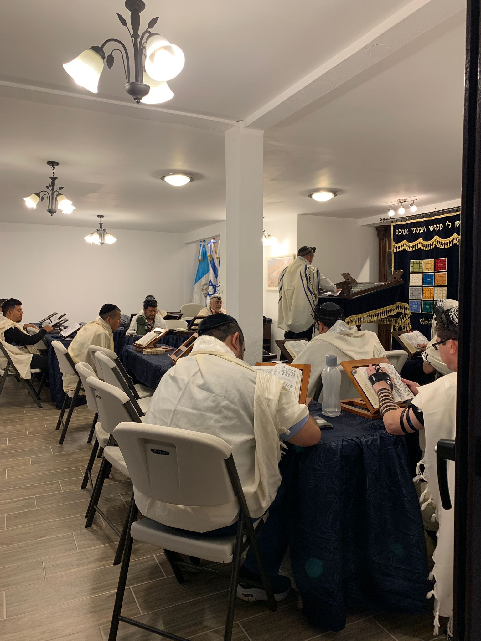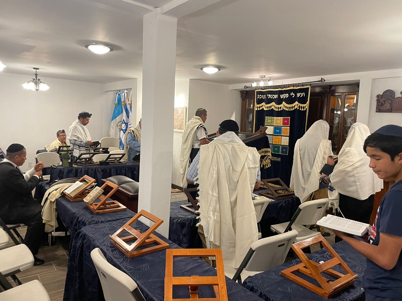 “This center was recently renovated and expanded to accommodate the community’s observance of Shabbat and Mitzvot. The focal point of the center is its beautiful Beit Knesset, which includes an Aron Hakodesh (Ark) replete with many meaningful symbols; one of them being a menorah reminiscent of a menorah found on a religious institution belonging to Bnei Anusim in Antigua, Guatemala and a beautiful Aron Hakodesh (Ark) covering from Israel. The center has rooms for each of the 15 families, rooms for the children’s shabbat classes, modern mikveh, kosher kitchen, rooftop area for a sukkah, and a large eating area for shabbat and yom tov meals. The center allows community members who live as far as 45 km (28 miles) away from their synagogue be able to come and spend shabbat together, as driving is prohibited on Shabbat by Jewish law.