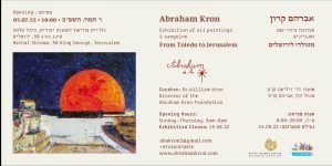 Gracias a una iniciativa de la Municipalidad de Jerusalén, se inauguró una exposición de arte de las obras de Abraham Kron en la galería del Museo de Arte Judío Heichal Shlomo, King George 58, Jerusalén. La exposición alberga veintinueve obras y recorre la cronología del pueblo de Israel desde los Patriarcas, pasando por el Monte Sinaí, el Exilio y el regreso a Eretz Israel; una cronología paralela a la vida personal del autor, superviviente de la Shoá y autor de libros y poesías cantadas en español. El evento ha sido organizado por su hijo, William Kron, nuestro alumno en Majón Miriam. Para concertar una visita a la exposición, contáctelo al +972-58 7070 976